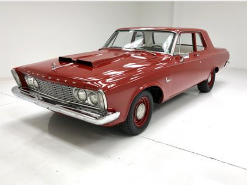 1963 Plymouth Savoy Mopar’s factory drag racing program escalated in 1963 on two fronts, first introducing lightweight versions of their already trimmed-down competition models and then enlarging the Max Wedge engine from 413ci to 426ci. The Max Wedge was made available in three levels of tune, beginning with the 11.1:1 compression, 415-hp Stage 1 engine. Special aluminum body pieces shaved approximately 150 pounds off the front of the car and included a dual scooped hood that delivered fresh air to the engine. It was a potent package, and it made the 1963 Dodge and Plymouth factory racers very tough to beat. Born as a slant 6 cylinder, with radio and heater delete, the consigner set out to create a clone of a Plymouth Max Wedge. Sans aluminum front end, and wedge engine, the transformation began. Exterior Stock steel wheels in red match the exterior of this car. A hood scoop is added which emulates the original Max Wedge.