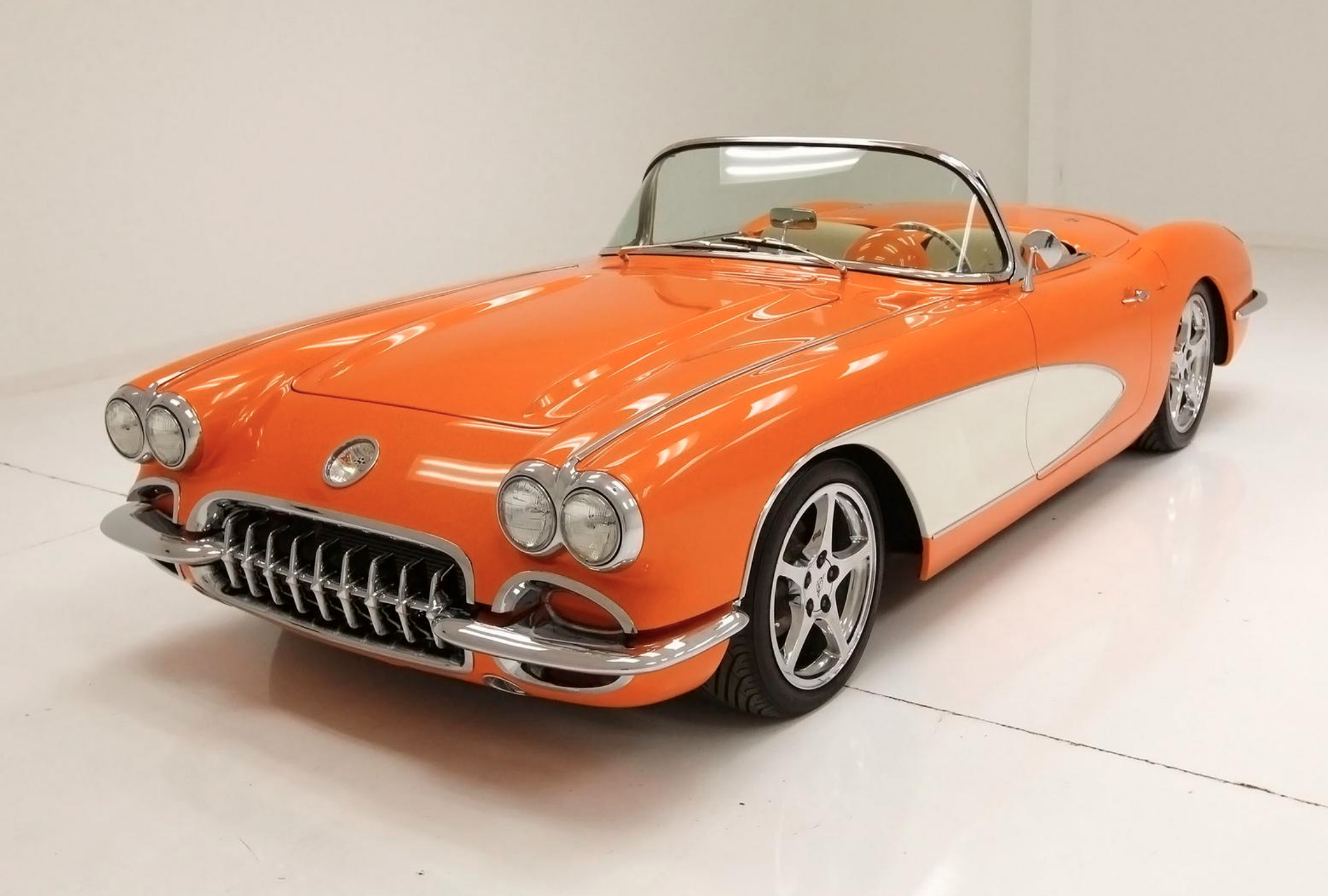 Benefitting from a comprehensive restoration by Mike Walker’s Street Rods Only shop in Decatur, Illinois, this sports car’s time-tested looks are backed by an impressive list of hardware that includes a 350ci Chevy ram jet mill coupled with and 700R 4-speed automatic transmission, this resto build is a wolf in sheep’s clothing. Exterior Virtually showroom new, a pristine frame, bodied with a 58 Corvette (some old, some new, mostly new), sprayed with 2 tone bright orange and sporting slightly off white coves, is truly a sight to behold. Eye catching yet tasteful, loud but soft spoken, ostentatious yet elegant, this Vette shows many sides. Custom five spoke C5 oversized chromed wheels and radial rubber bands are on all four corners. Interior Two tone tan interior leather featuring cream insides and tan bolsters occupy a cozy passenger space. An exterior matching dash wraps around the front of the buckets and stretches from door to door.