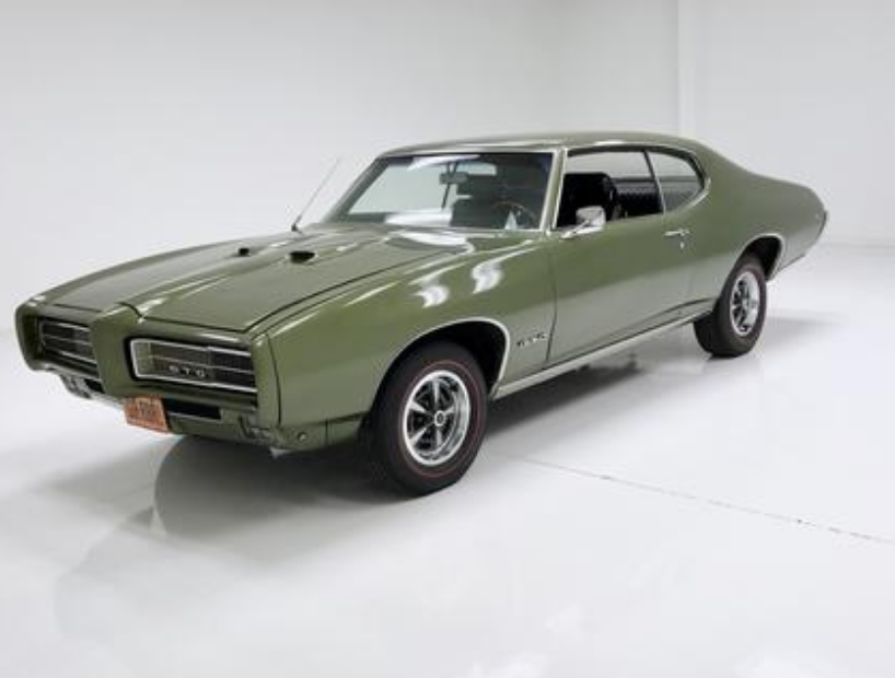 This code 73 color (Verdoro Green Metallic) GTO or tongue-in-cheek “Goat” supposedly because it would EAT anything (i.e. the competition) or “Tiger” (voracious) is a fair example of the American Muscle Car in its heyday. 51,994 miles (not known if original) sports rally wheels and redline tires, as well as a short sport shifter, and rally steering wheel. Exterior Repainted to color Match Verdoro Green Metallic, shows some blistering on the hood, as well as rear quarter panel repairs with slightly noticeable imperfections. Rust is showing on left door and appears to be surface variety. Fit and finish is not perfect, but typical of a car from 1969.