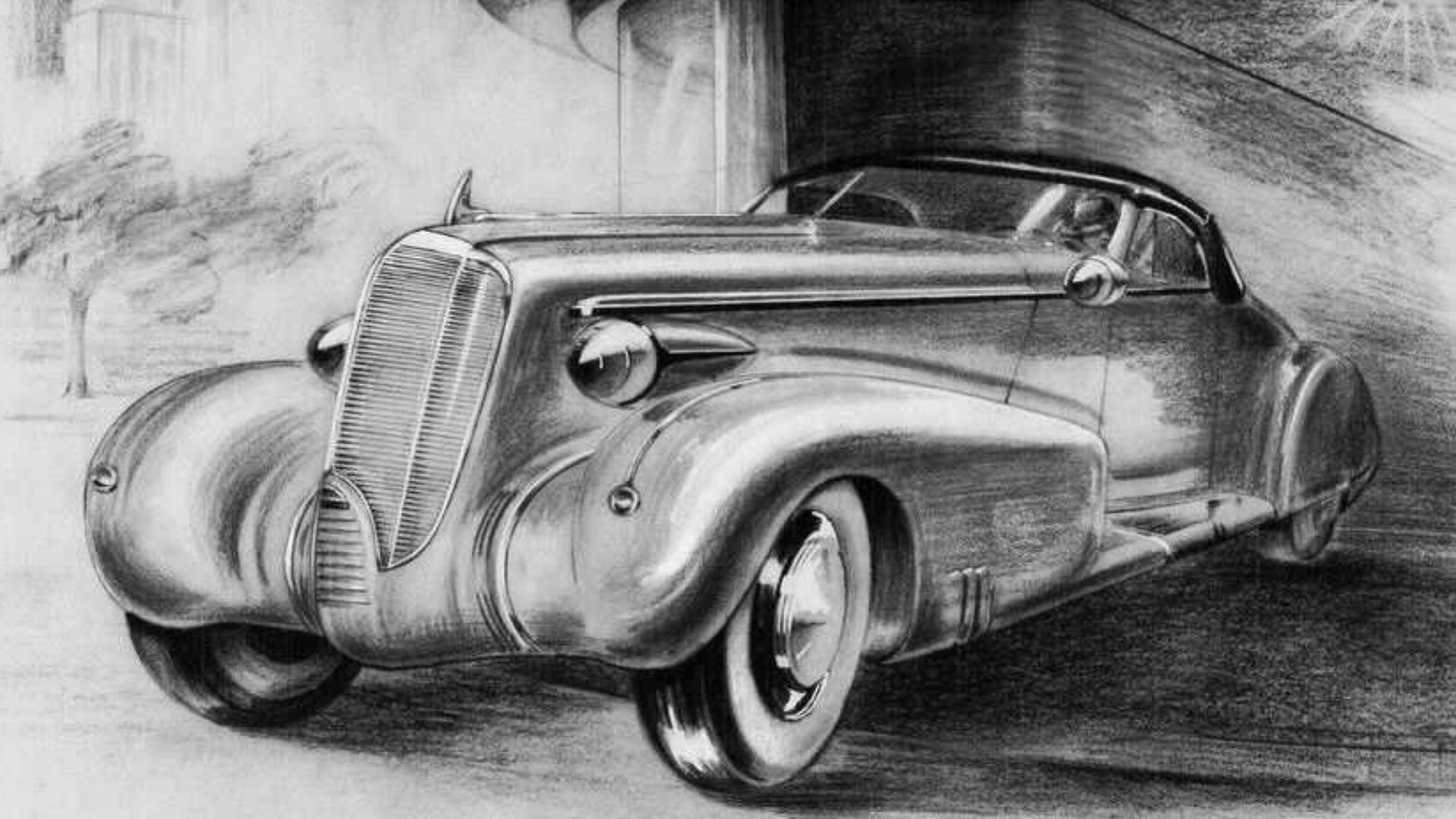 Most notable among the sketches is the first-gen Cadillac Series 62, a legendary automobile, which was drawn by none other than Art Ross in 1937. His line drawing perfectly captures the kinetic motion of the large, gracefully-styled car as it speeds down the road and toward the viewer. Ross had a hand in the final design of the Series 62, working alongside Bill Mitchell.