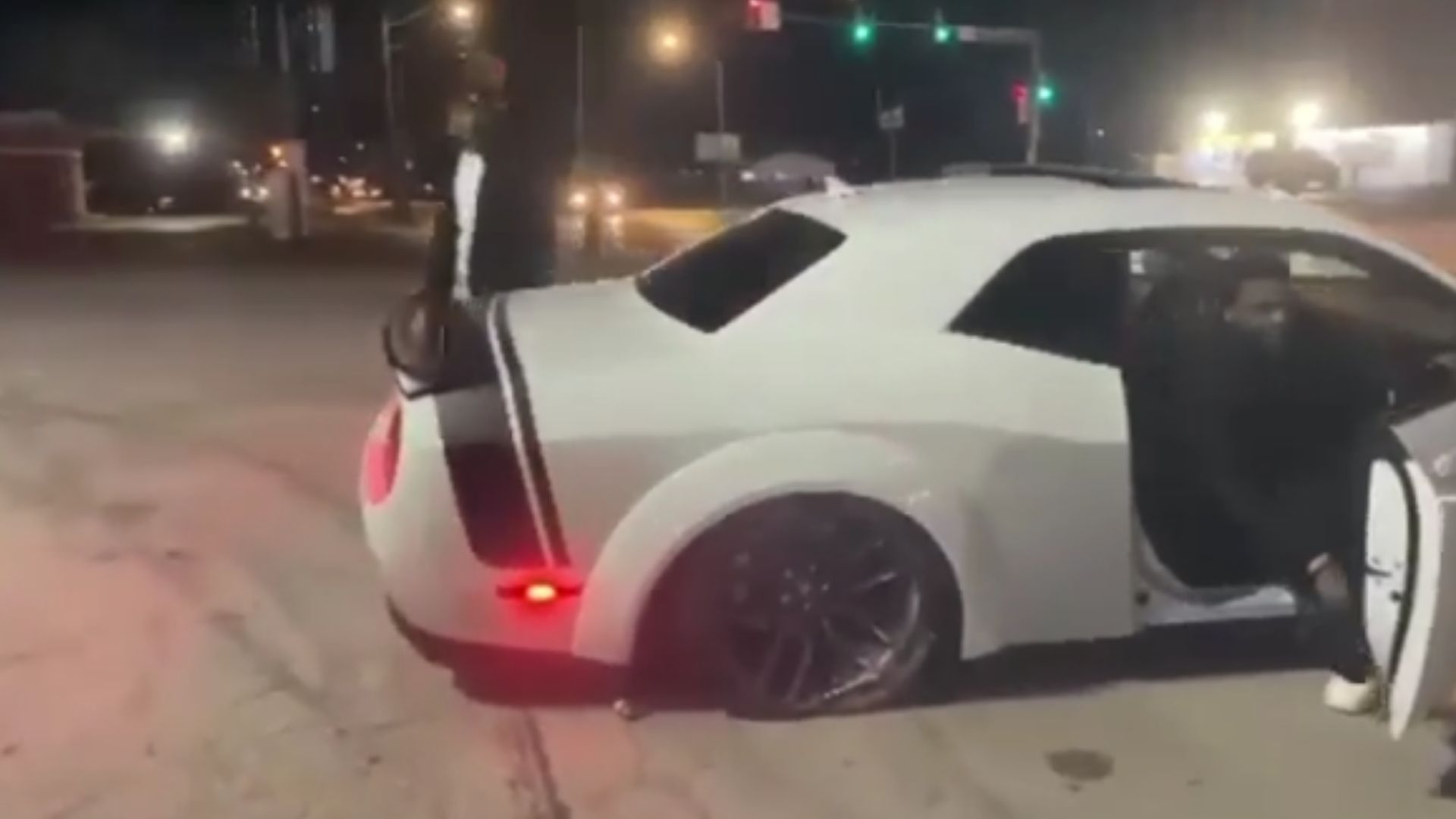 Immediately, all the people who were gathered on the side of the road to watch this fool do his little stunts on a public road instead of taking it to the track come running over to gloat, mock, taunt, etc. That’s requisite anytime someone does stupid stuff like this. And we’d be willing to bet these same people were telling the driver to do a burnout on the road in the first place. So they pressured him into doing something dumb and then make fun of him for doing what they said. And that’s about the level of intelligence involved in these sorts of street takeover activities.