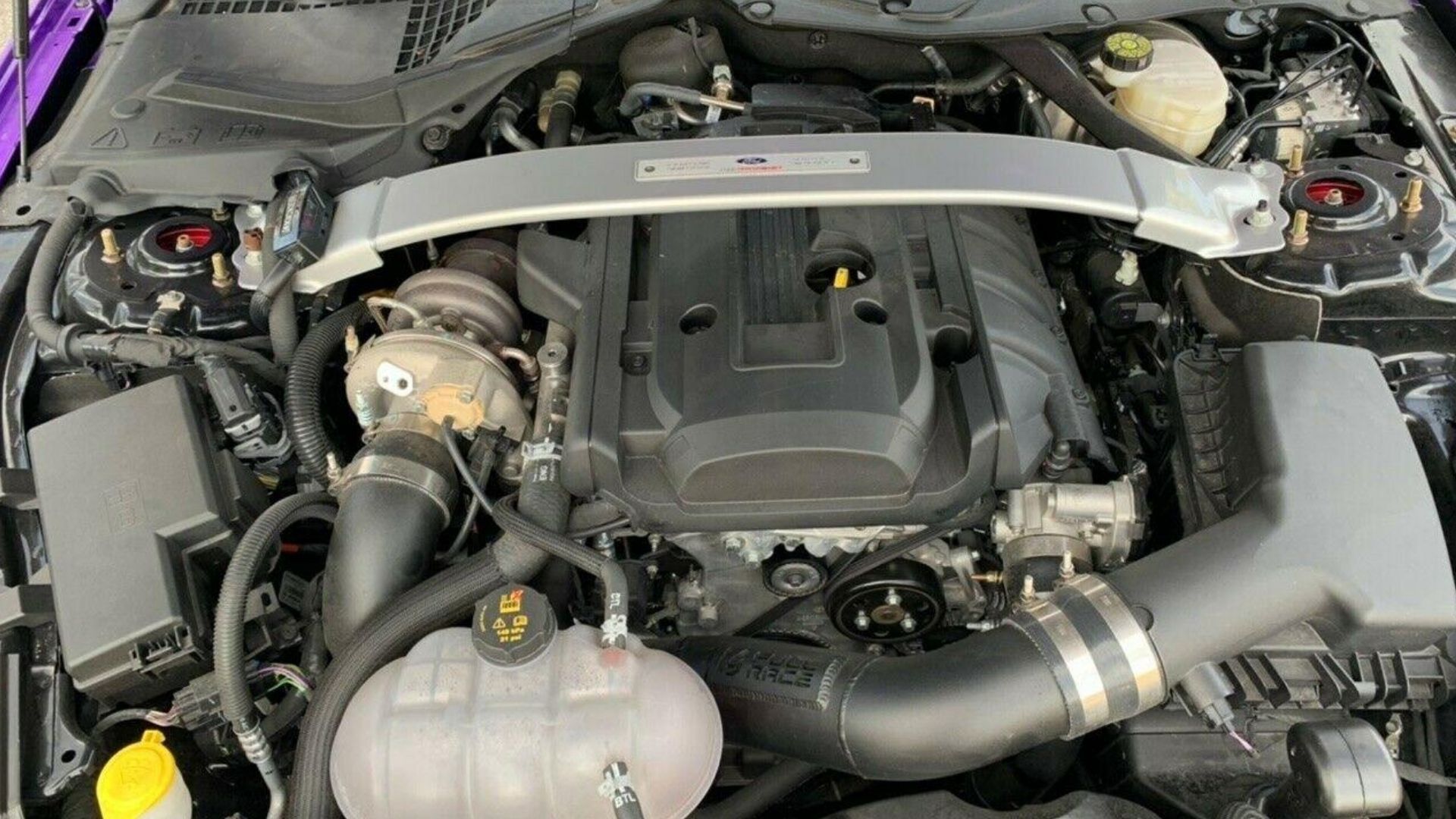 Here’s what easily could be a dealbreaker for a lot of people and understandably so: this Mustang is an EcoBoost model. Yeah, disappointing, because the Coyote V8 is such an incredible engine with lofty potential for those who want to reach for the stars. At least this EcoBoost is running a Borg Warner turbo, Full Race intercooler/manifold, and Ford Performance exhaust. Just don’t think you’re going to be taking down any Hellcats ever.