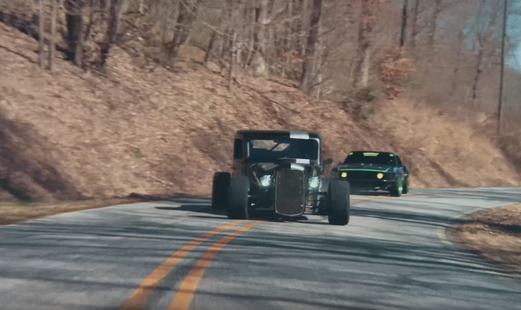 The 1935 Ford keeps an even line, his tactic is less show and more go in efforts to win the race. Despite some incredible driving on the part of the '35 Ford, the Mustang passed it with one fell swoop in the final turn of the battle. This was done by taking the outside of the turn and then changing direction for the second turn while still in the first, this put the Mustang into a position where it was already on the inside of the turn and was able to overtake the hot rod. The scene ends with the two cars lining up and the Mustang triumphantly declaring its victory with a cloud of blue smoke.