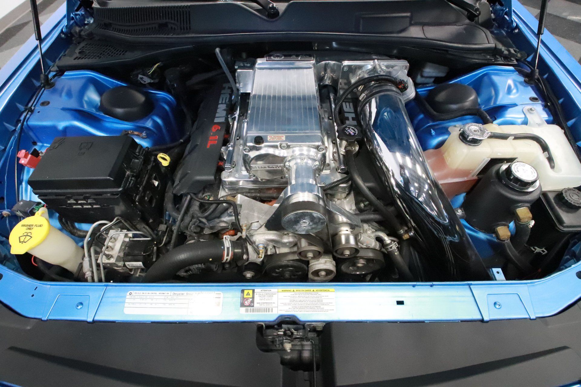 Since this car has well under 8,000 miles on the odometer, the interior looks essentially brand new. Accent pieces in the dash, center console, and seats match the exterior paint. White gauge faces, plus Mopar A-pillar pod gauges add to the cool factor. Superbird embossing on the headrests and HPP floormats are also nice upgrades. Don’t forget this Dodge has power everything, Bluetooth, USB connectivity, airbags, air conditioning, and other modern perks.