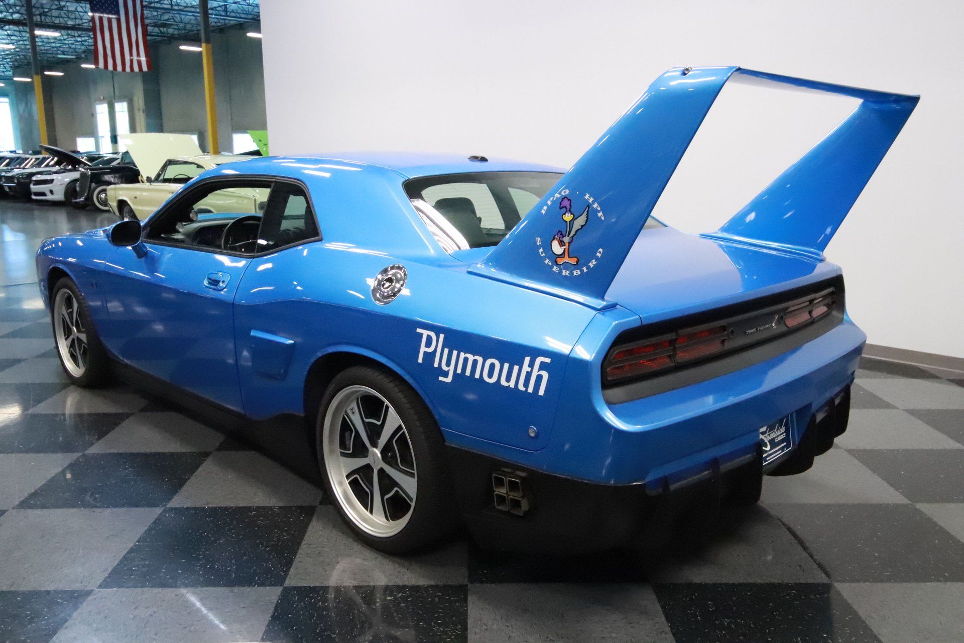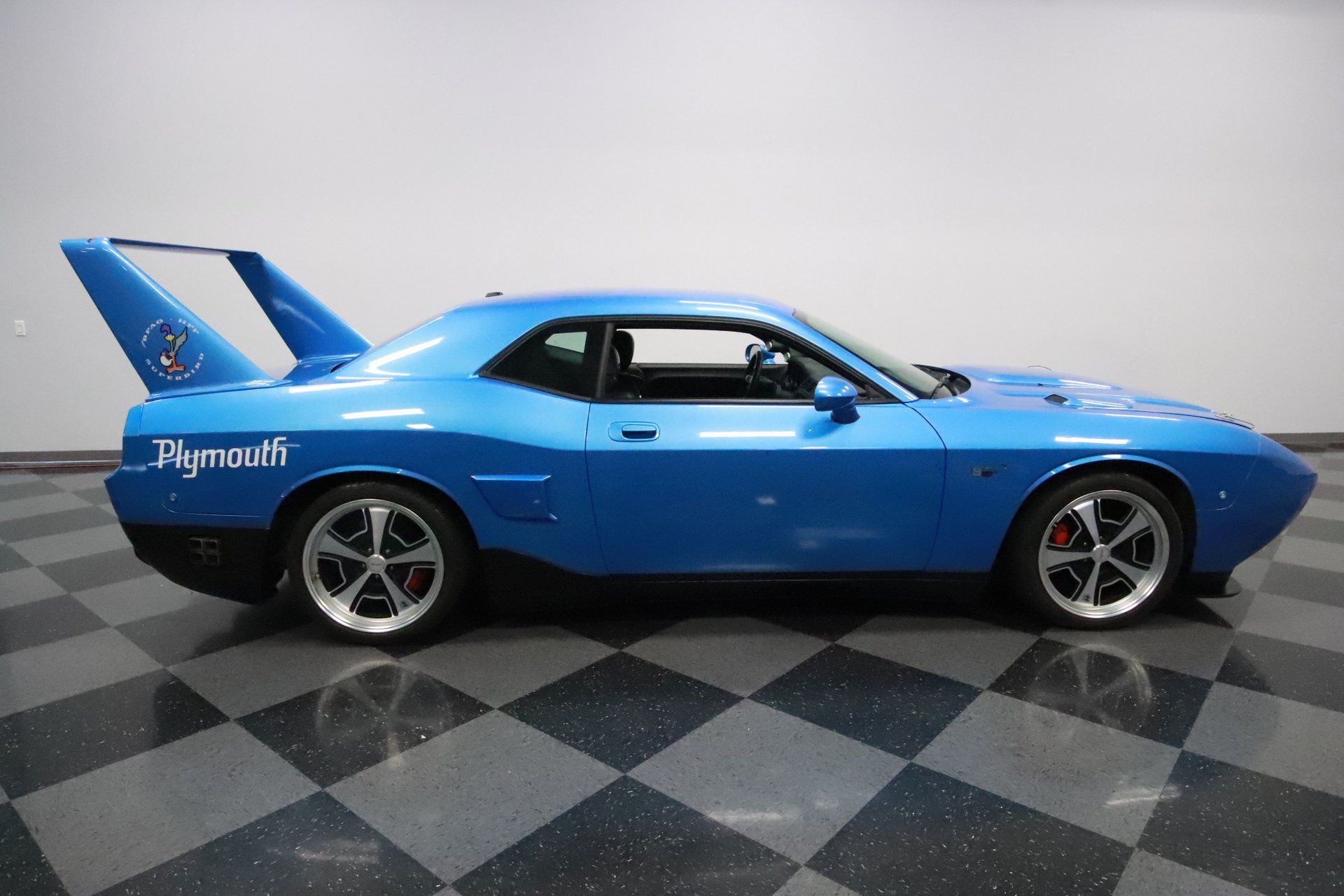 The two biggest features from the Plymouth Superbird are on display with this beautiful Blue Pearl, customized Dodge Challenger. An aerodynamic nose cone recreates one used to help the original car hit NASCAR-dominating top speeds. Around back is that super tall wing, adding stability on long straightaways. Other elements like the hood pins, side scoops, and customized rear fascia tie this car to the classic even better. Road Runner cartoon decals like what came on the original car adorn this one, which is a fun detail. You also get HPP Plymouth alloy wheels with an appropriately retro design.