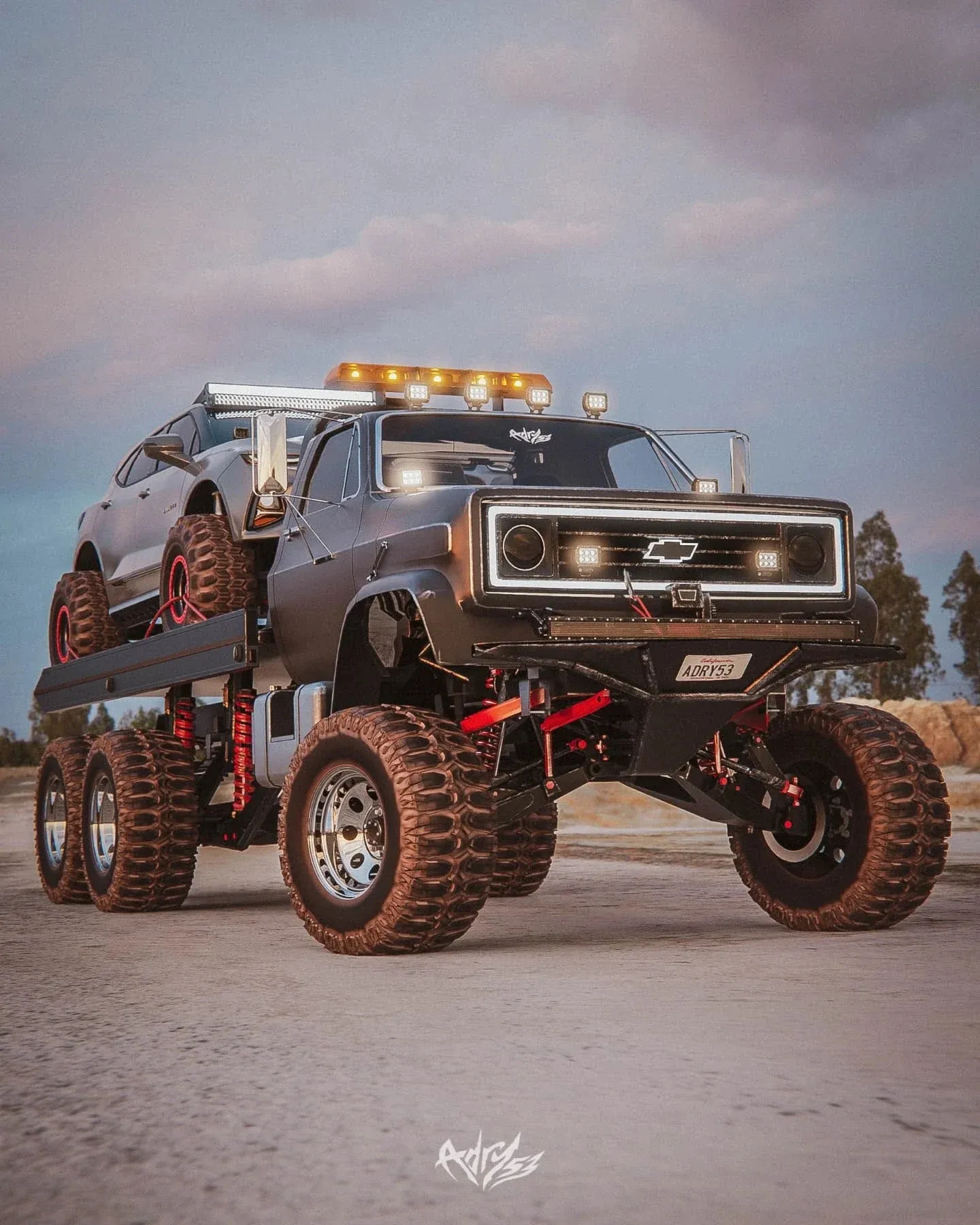 What happens when old-school GM workhorse meets modern off-road excess? Automotive artist Timothy Adry Emmanuel (@adry53customs) answers that question with a stunning new rendering of a lifted, 6×6 Chevy C70, built to haul a similarly modified Chevy Blazer in trophy truck fashion.