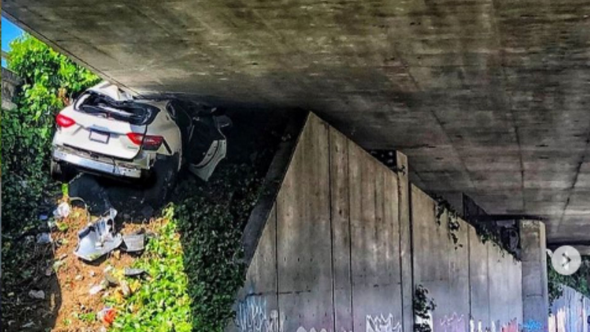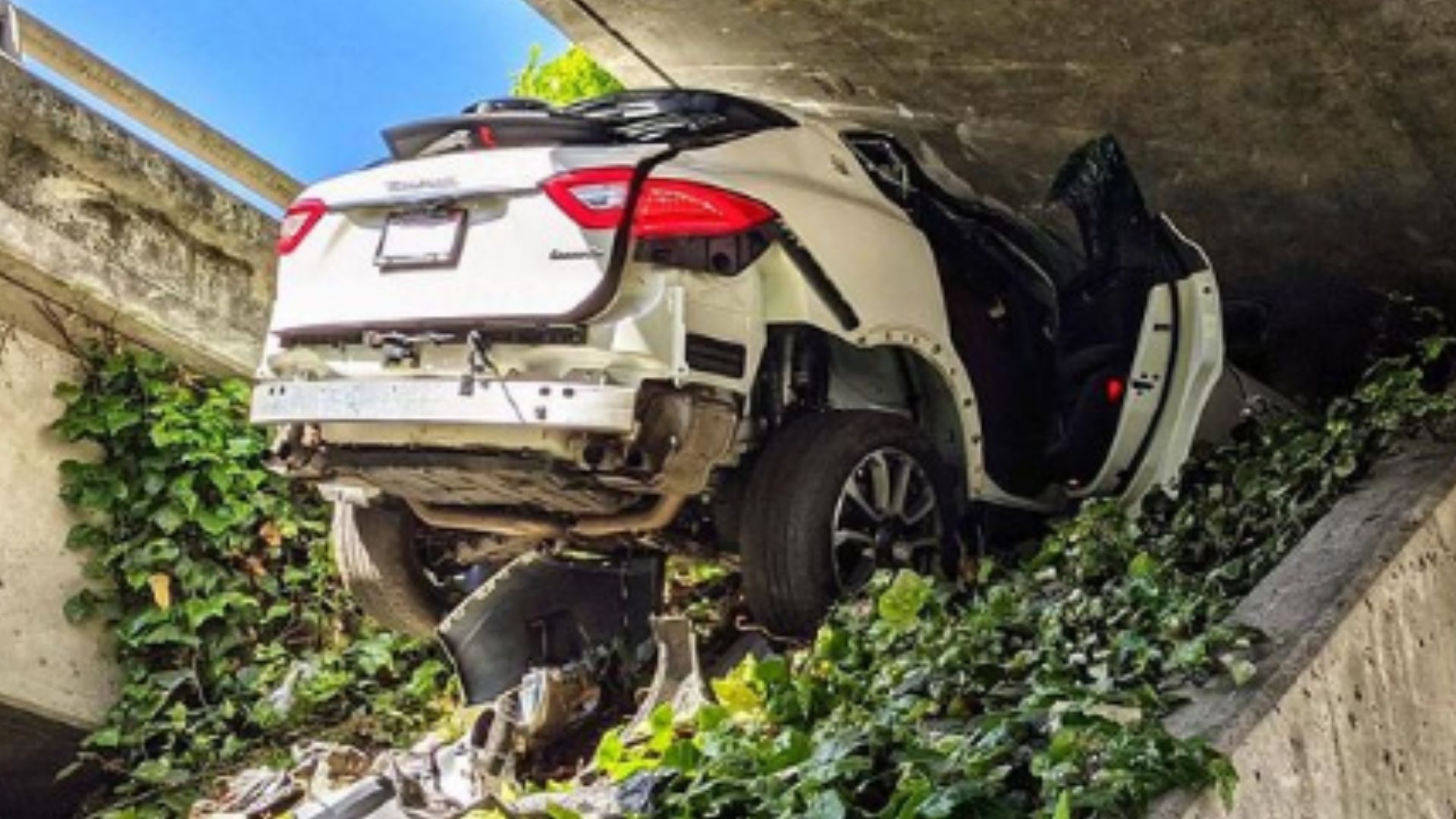 We’re guessing a lack of stability combined with going at a high speed was the driver’s undoing. He exited the highway, probably to try losing the CHP officer, but drove the Maserati up an embankment at the overpass, pinning the luxury SUV between the underside of the highway and the slope.