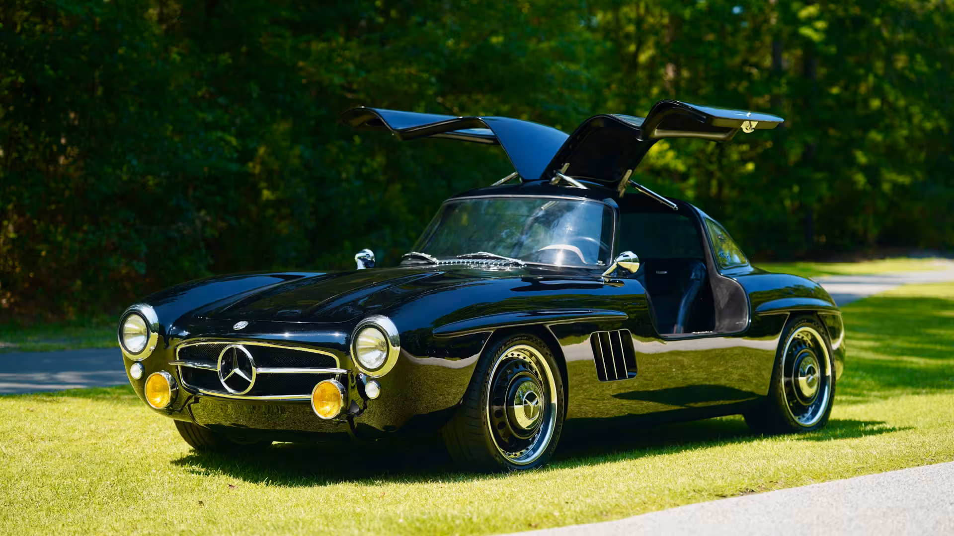 Visual cues do the bulk of the transformation work. The black exterior paint hides dimensional differences between the restomod and a true 300SL, while custom 18-inch three-piece wheels accept 300SL hubcaps for authenticity. Michelin Pilot Sport Cup 2 tires supply modern grip. Roof-mounted gullwing doors, a defining trait of the 300SL lineage, complete the look and blur the line between old and new.