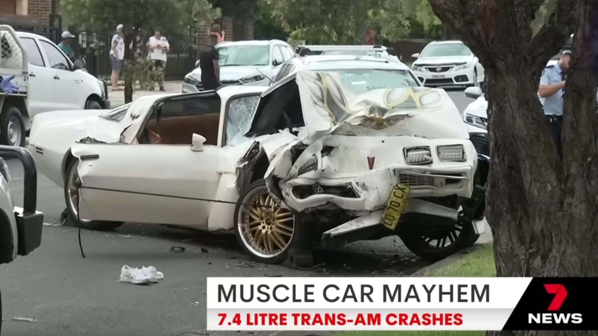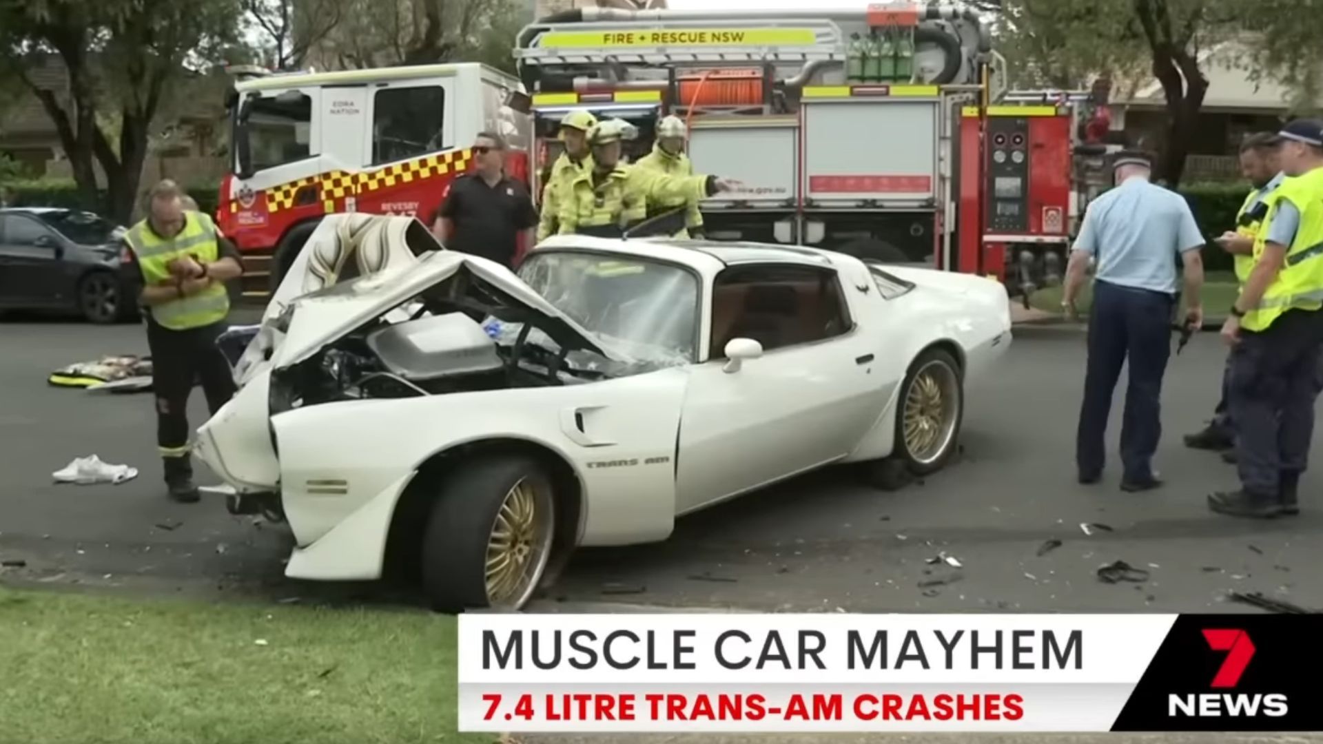 “A beast of a car” – that’s how a local reporter characterized a Pontiac Trans Am after it terrorized an Australian neighborhood before crashing. Of course as we all know American muscle cars are horribly dangerous and absolutely drive themselves, absolving the person who may or may not have been behind the wheel of all responsibility. Sadly, the so-called driver in this incident had to be carted off on a stretcher with a neck brace attached, all thanks to the assault muscle car’s reckless behavior.