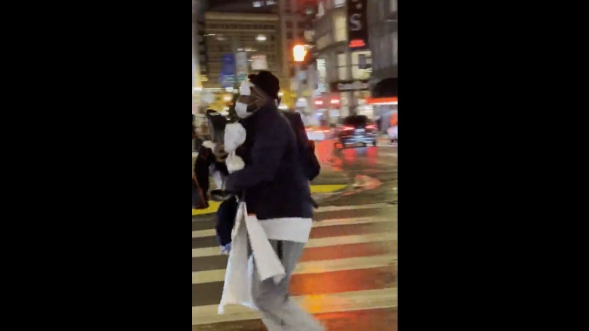 What’s really funny is right before the cops show up and bust the Mustang driver, the bystanders capture on camera a guy just running down the streets with his arms full of what looks like clothing. The guy has two masks on, one over his nose and mouth and one just above his eyes, probably in an attempt to hide his identity. Hey, it worked for train robbers in the Wild West, right?