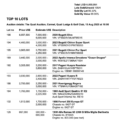 Bonhams|Cars nets $44.7 million and 96% sell-through at The Quail, led by a record $8.6M Bugatti Divo sale.