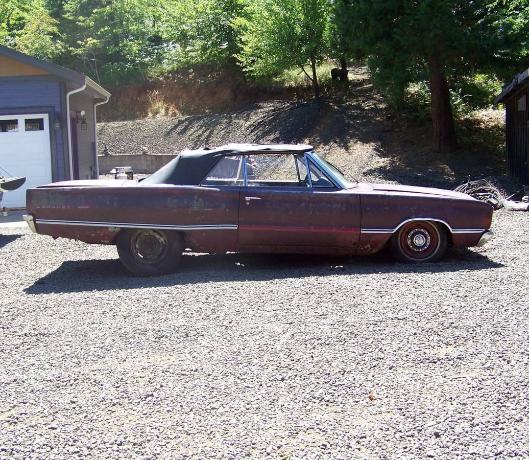 A forgotten 1967 Dodge Coronet 440 convertible reappears near Portland, offering more rust than redemption for a budget price.