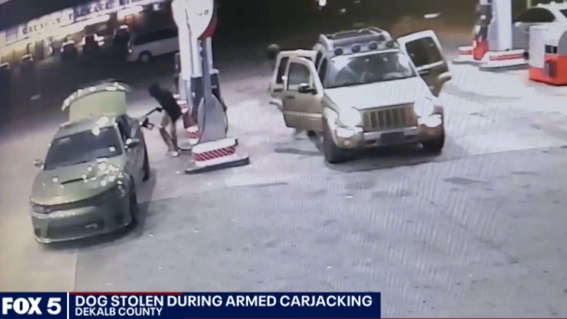 In the surveillance video you can see the ambush take place. Four men pull up in a greenish-brown (as described by the news) Jeep Liberty at the next pump over, then three of them pile out and head straight for Gonzalez and his car. After telling him to step away, the men piled in the green Dodge Charger and took off with the dog inside.
