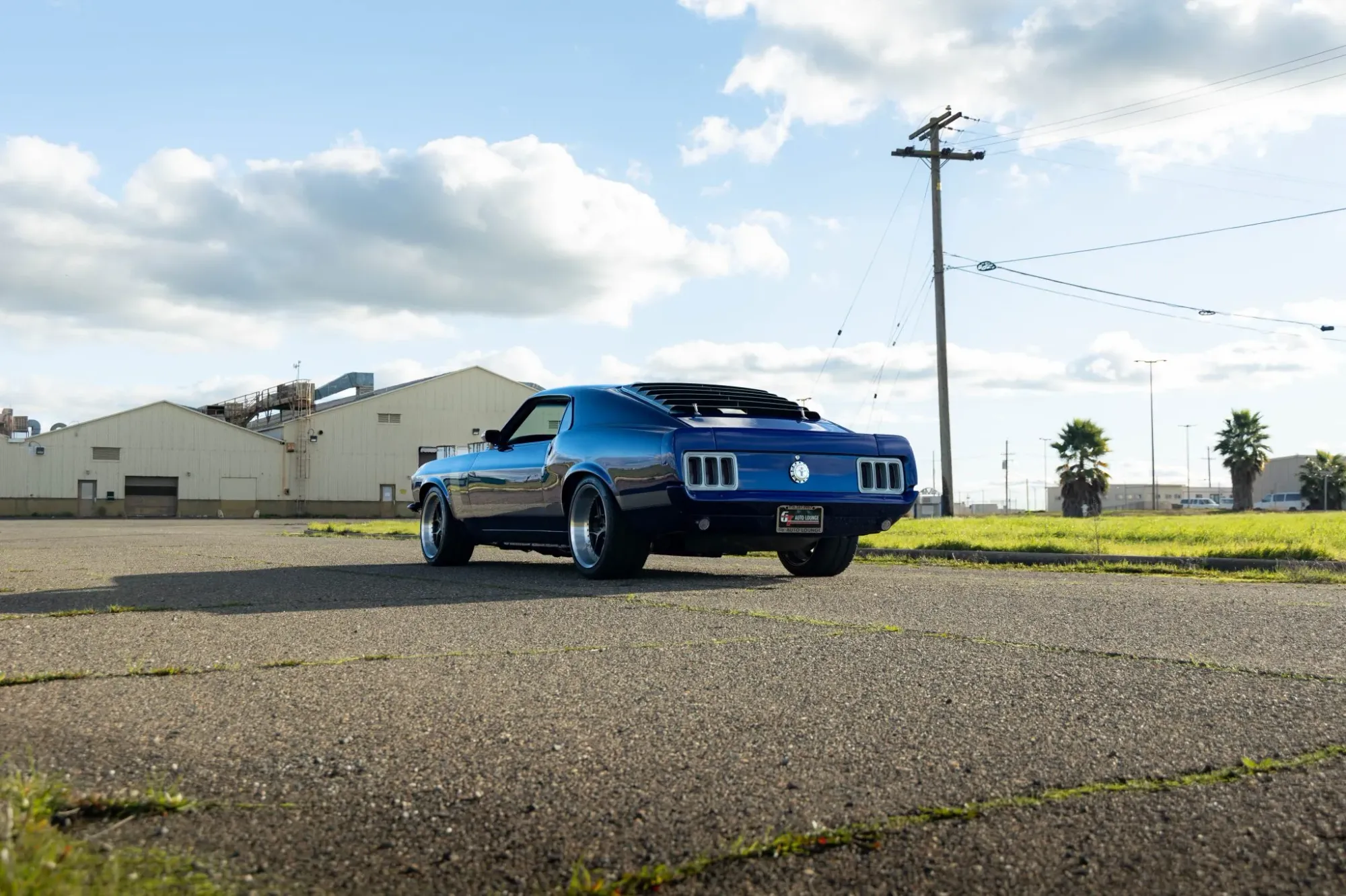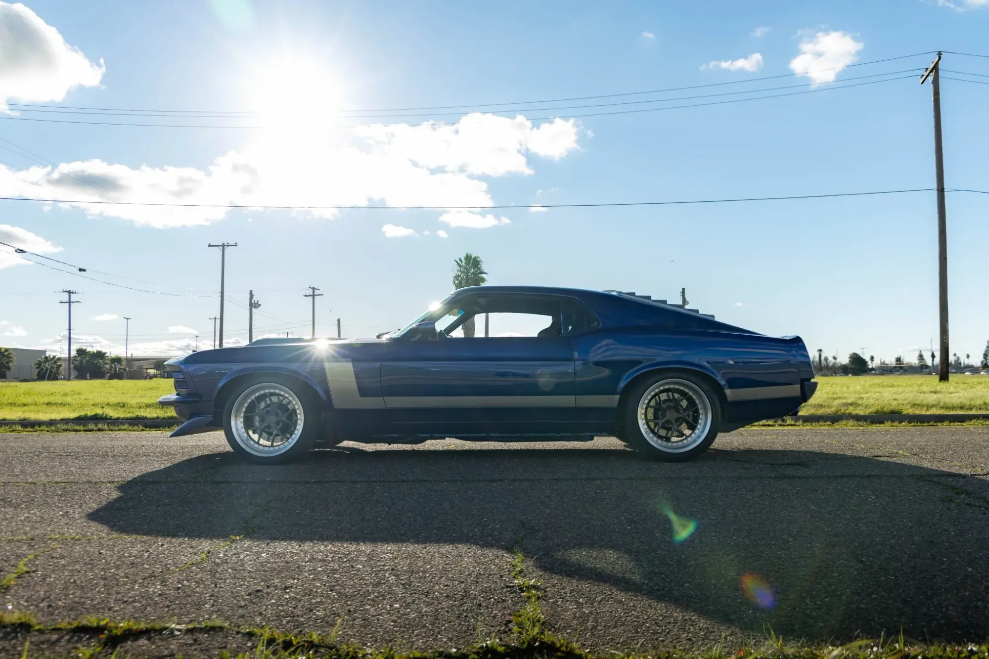 The Mustang’s exterior was extensively reworked during the build. Finished in metallic blue with silver accents, the body features shaved doors and decklid, a hood scoop, silver-painted rear window louvers, and color-matched bumpers and front spoiler. Silver hockey-stick stripes and painted taillight bezels further distinguish the car. Paint blemishes are noted in the listing gallery.