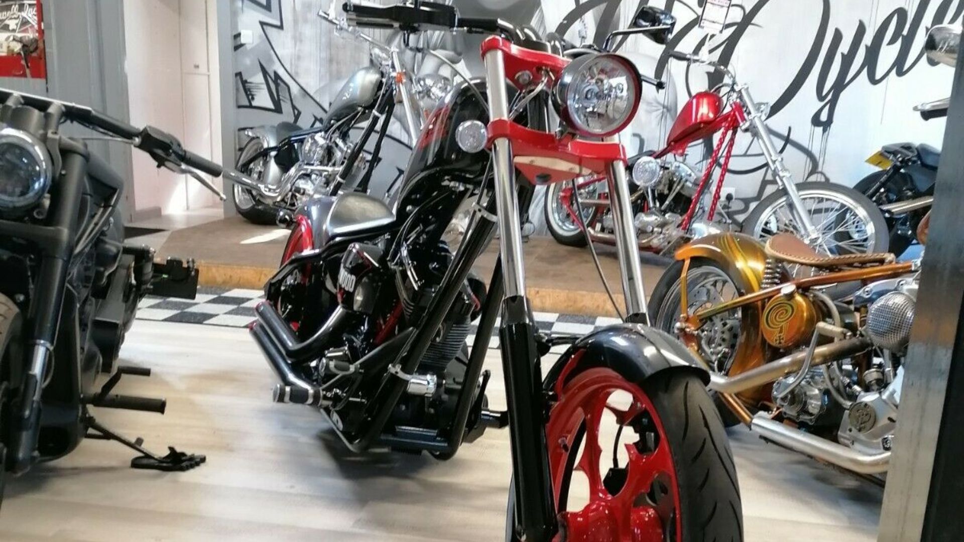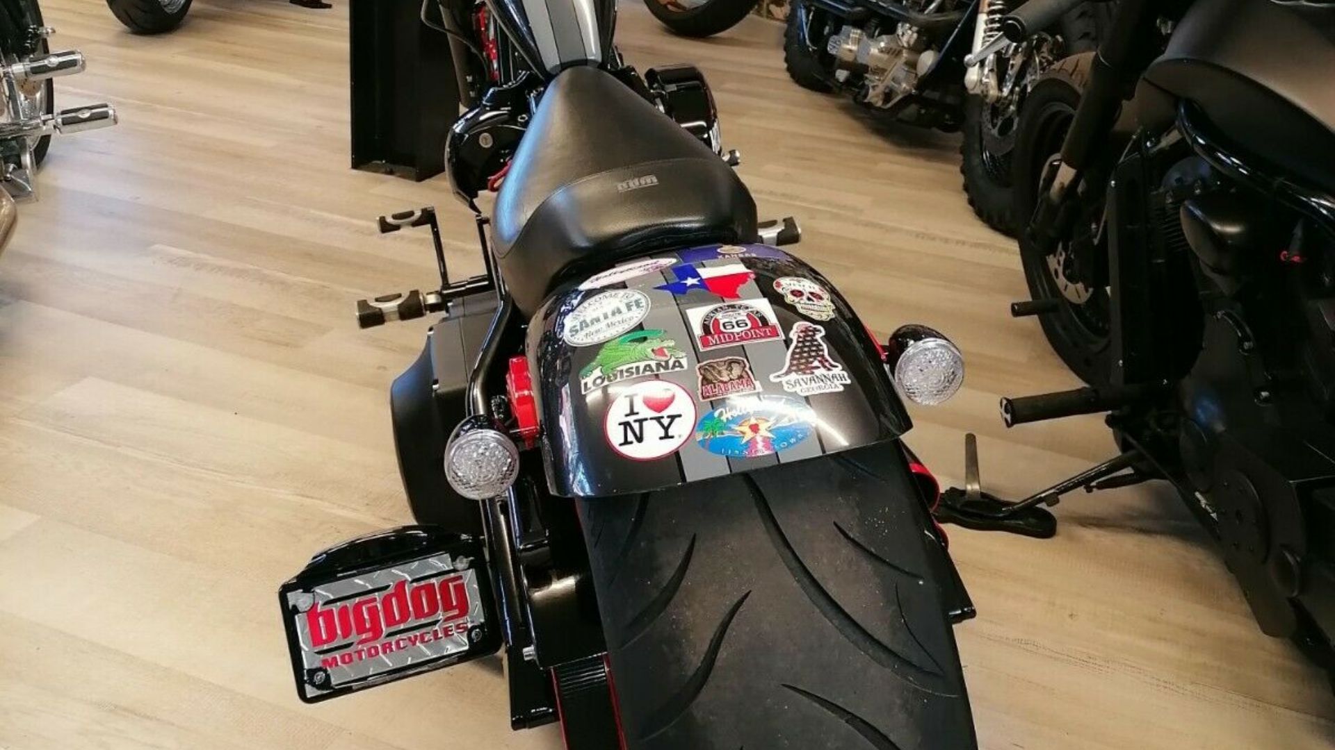 Sporting an interesting black and red paint job, even on US roads this chopper would be distinct. So is the characteristic Big Dog styling from the defunct-but-maybe-back builder out of Wichita, Kansas.