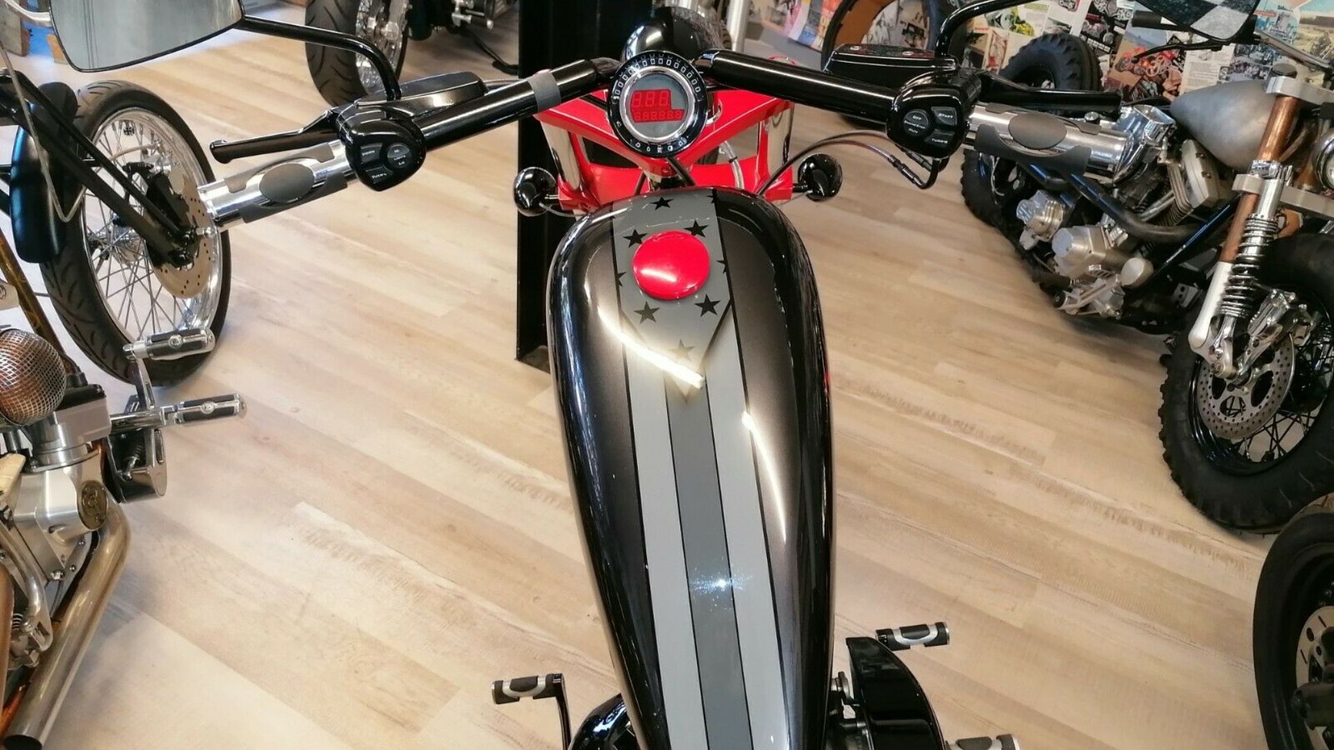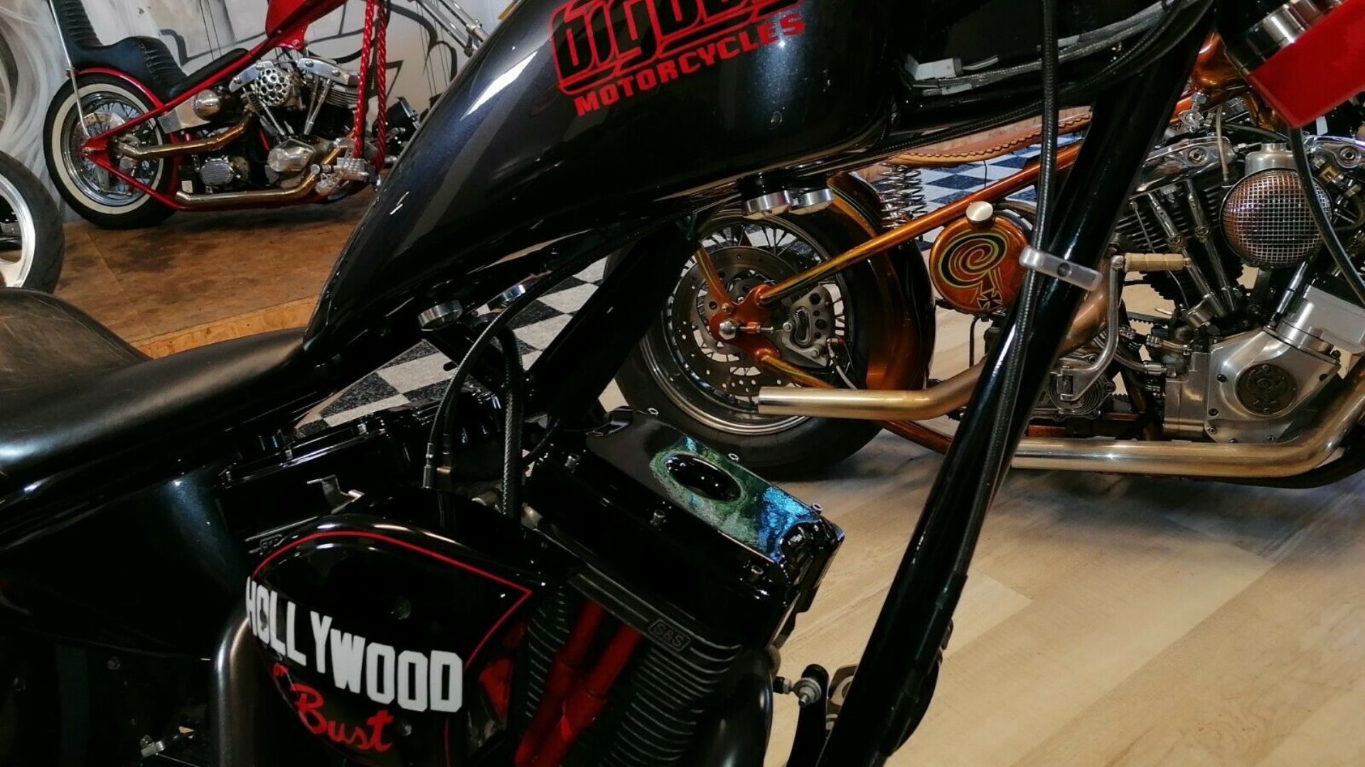 Adding to the exotic flair of this bike are some interesting details, like a gray, white, and black American flag pattern on the top of the tank, a “Hollywood or Bust” graphic, plus stickers from numerous states on the rear fender.