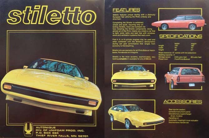 The Stilleto was available on the Pinto, Pinto Wagon and Pinto Runabout (hatchback) adding a "European flair" to Ford's compact car. The biggest modification is the Plymouth Superbird-style front clip, but the kit also includes some cool-looking ground effects. According to the brochure information we were able to dig up, the kit only required users to have to remove the fenders, hood and bumpers, and the total kit cost $1,999. Optional accessories for the Autonique Stilleto included a Superbird-style spoiler for the sedan, a supercharger for the four-cylinder engine and a handling kit.
