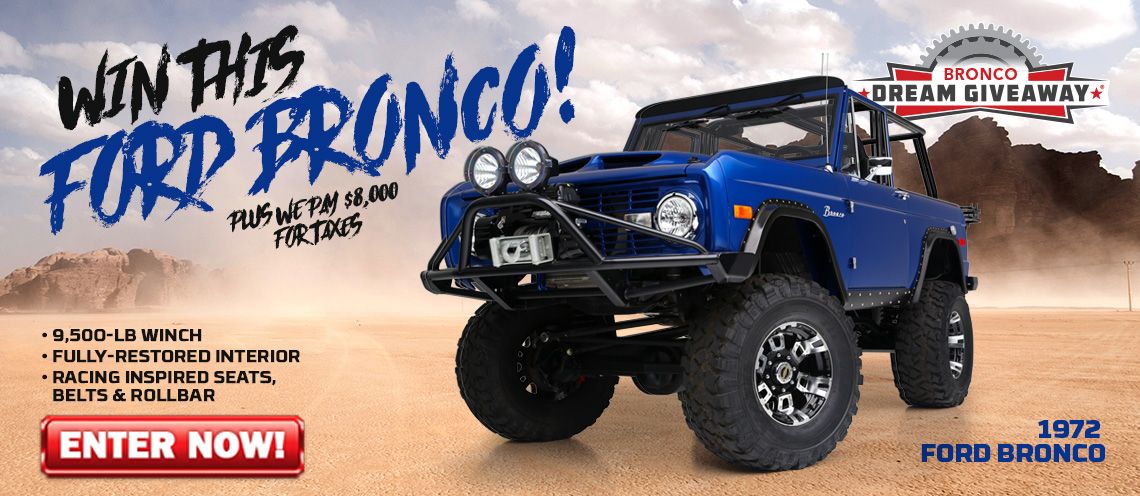 The first-generation Bronco is one of the hottest vehicles in the collector-car market right now, and here's your lucky chance to win a custom 1972 Ford Bronco through the Bronco Dream Giveaway. The best part is that all of your donations go to charity and that means veterans and children benefit big-time from your generosity.