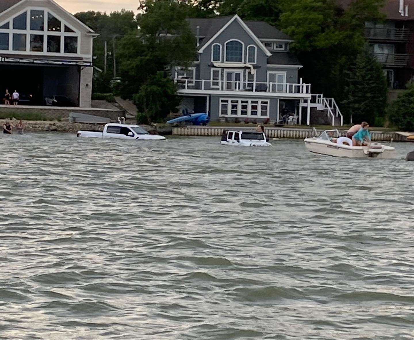 Sadly, this ill-advised rescue did not go as planned as the boat and both off-road vehicles were left partially submerged in the lake water, but fortunately, it doesn't appear that any people were injured.